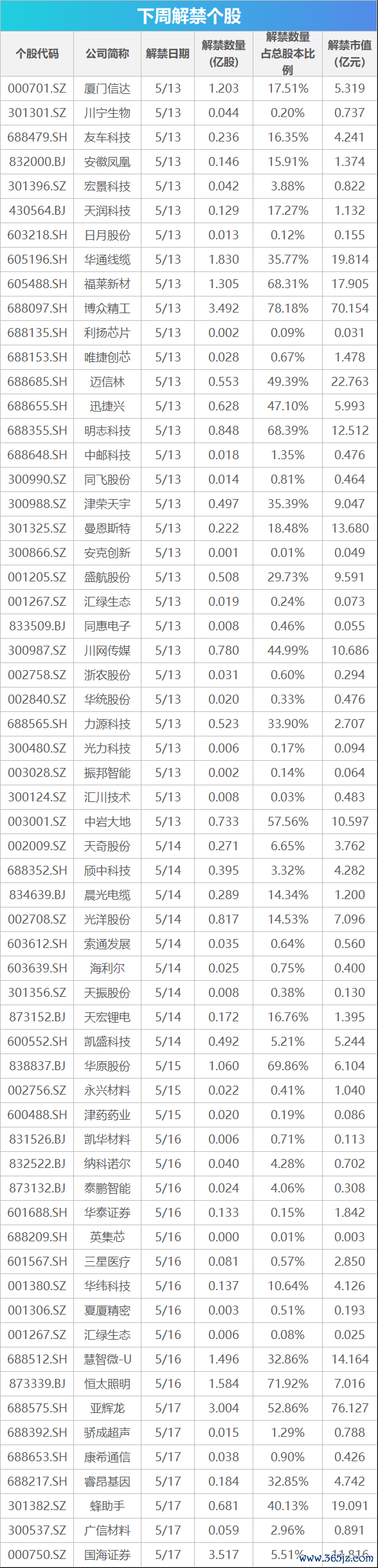 据Wind数据显示,下周(5月13日至17日),沪深两市将有超28亿股限售股上市流通,以5月10日收盘价计算,市值近400亿元,均较本周环比大幅下降。个股来看,解禁市值较大的公司有亚辉龙、博众精工、迈信林、华通线缆、蜂助手、福莱新材等,其中前三家限售股解禁市值最高,均超过20亿元,且均是科创板公司。